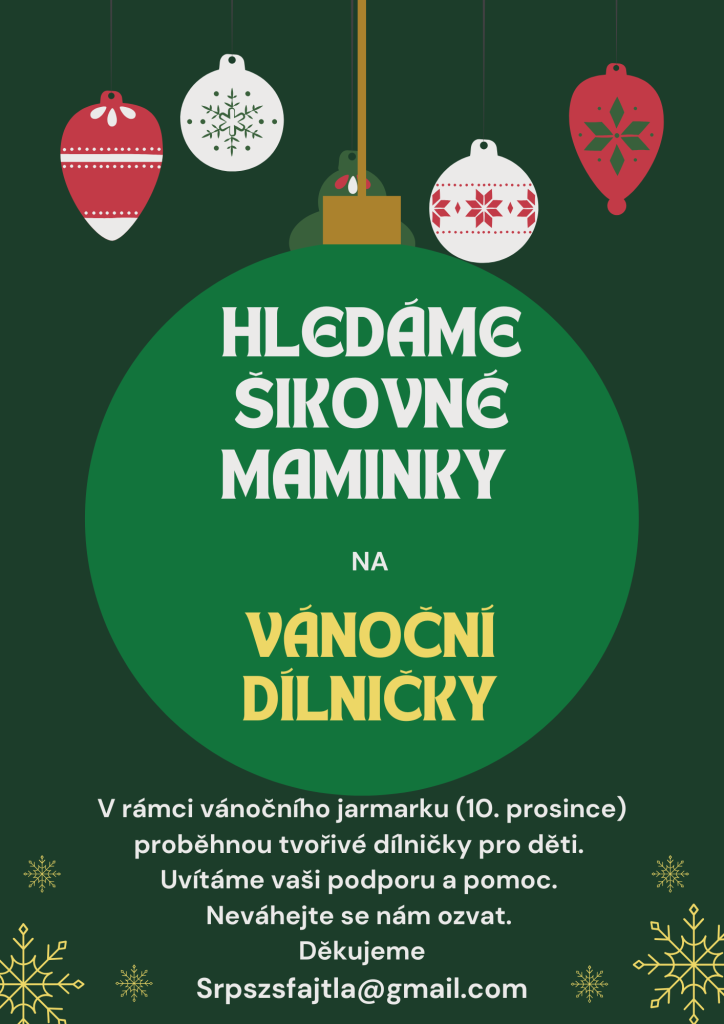 V rámci školního vánočního jarmarku (10. prosince) proběhnou i tvořivé dílničky. Hledáme maminky, které by dětem pomohly s výrobou vánočních ozdob a dekorace. Pokud se chcete zapojit, napište nám prosím na srpszsfajtla@gmail.com a domluvíme si podrobnosti. Děkujeme