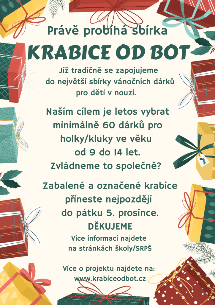 Jako každý rok, i letos se ve spolupráci se SRPŠ připojujeme k největší sbírce vánočních dárků v ČR Krabice od bot.