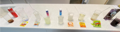 Každý žák měl za úkol proměřit pH připravených vzorků (Obr. 3) komerčně dostupných potravin jako je Coca Cola, kyselina citrónová, jedlá soda a mnoho dalších.