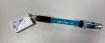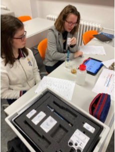 Díky naší škole, která zakoupila sofistikované sady sensorů (Obr. 1) firmy Pasco, mohl každý žák provést měření pH pomocí skleněné elektrody (Obr. 2), která je právě součástí těchto nových sad. Každý sensor lze pak propojit s iPady, které mají žáci rovněž k dispozici a ihned vidí díky bezdrátovému propojení nejen měřené hodnoty, ale zároveň i grafické znázornění sledovaného průběhu měřených veličin.