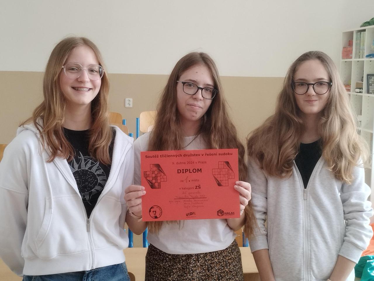 V úterý 9. dubna 2024 proběhlo v Praze regionální kolo v řešení sudoku. Tým ve složení Anna Muchková, Sofie Langrová a Anežka Krummerová získali 1. místo a probojovaly se do celostátního kola. Gratulujeme!